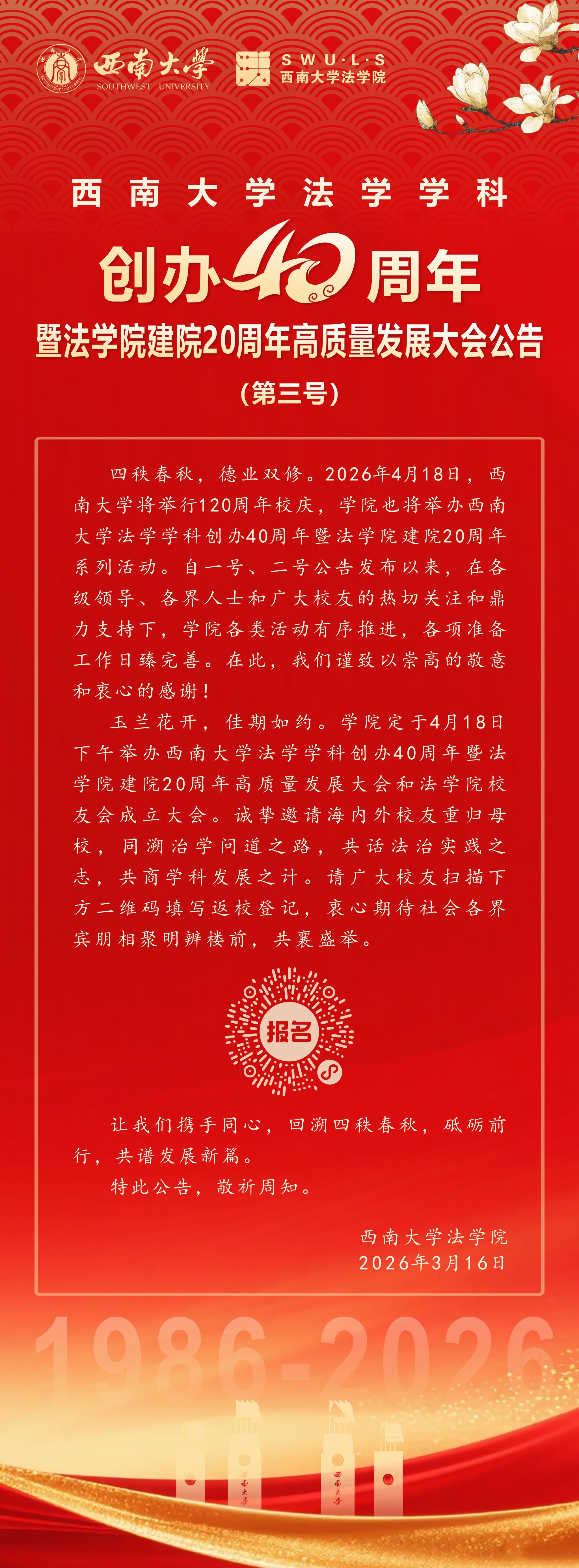 西南大学法学学科创办40周年暨法学院建院20周年高质量发展大会公告(第三号)