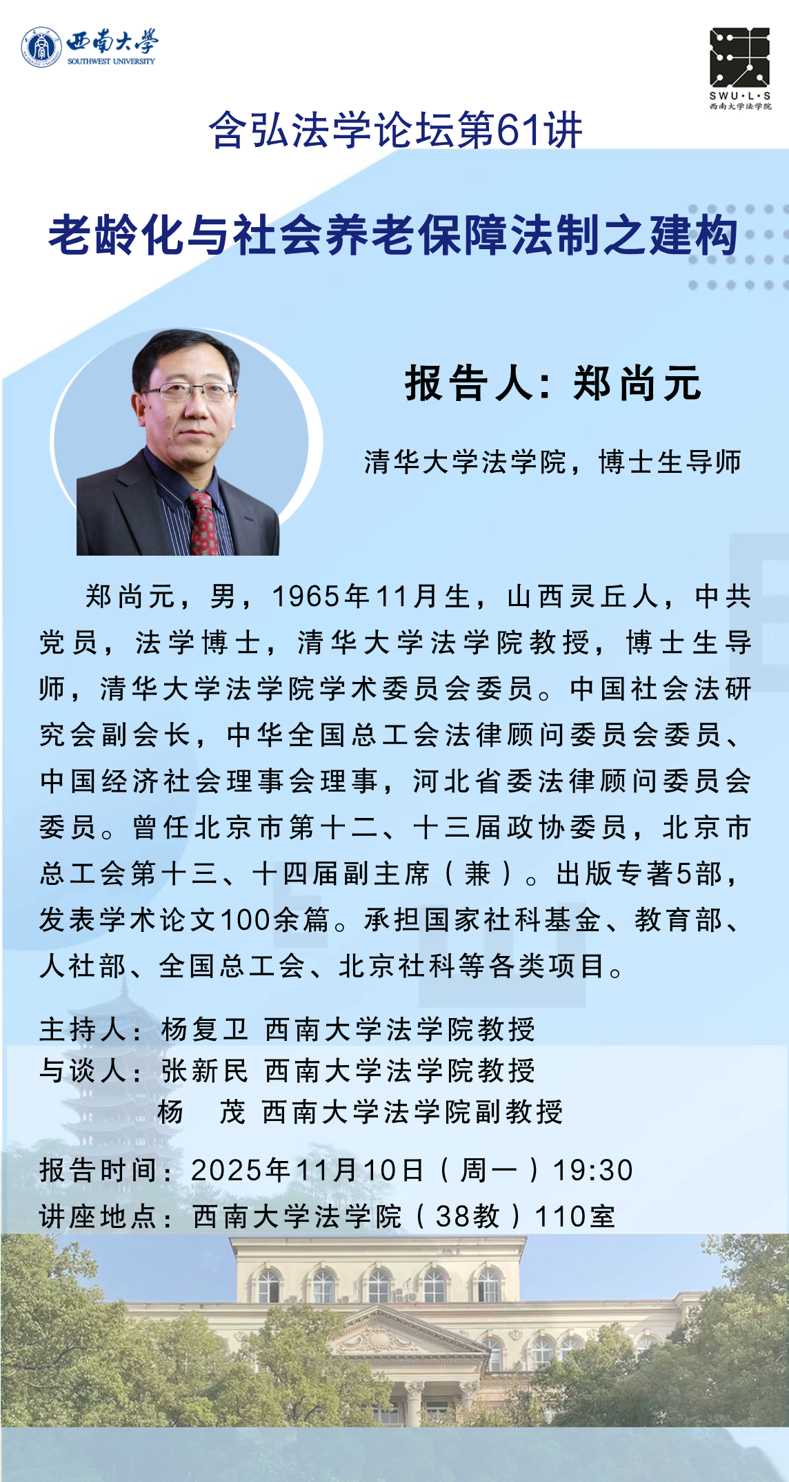 【含弘法学论坛第61讲】(11月10日)郑尚元:《老龄化与社会养老保障法制之建构》