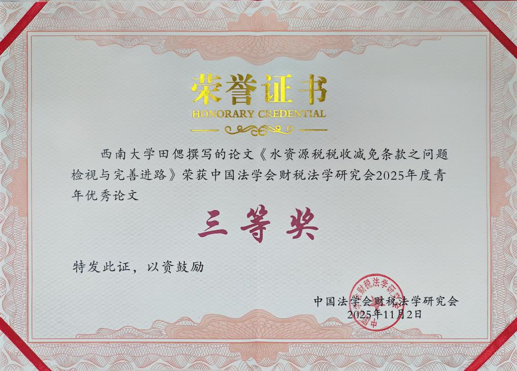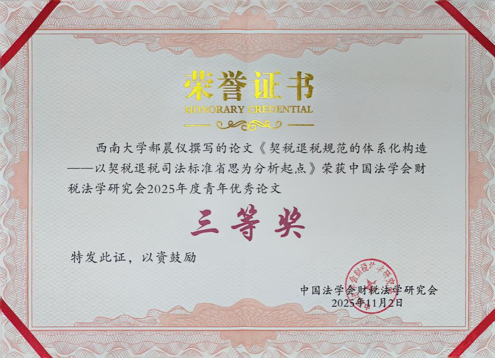 本次年会延续传统,继续评选青年优秀论文奖。2024级经济法学硕士生郝晨仪撰写的论文《契税退税规范的体系化构造——以契税退税司法标准省思为分析起点》和2024级法律(法学)硕士生田偲撰写的论文《水资源税税收减免条款之问题检视与完善进路》,同时荣获中国法学会财税法学研究会2025年度青年优秀论文三等奖,整体展现了西南大学财税法团队青年学子的卓越风采。