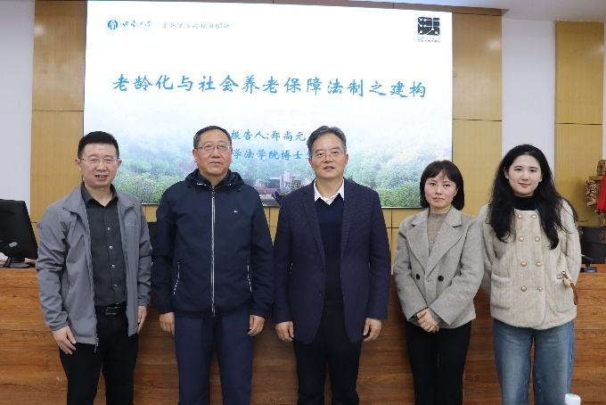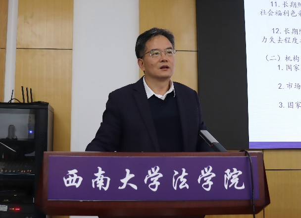 2025年11月10日,西南大学法学院举办含弘法学论坛第61讲——“老龄化与社会养老保障法制之建构”专题讲座,特邀清华大学法学院教授、博士生导师郑尚元担任主讲。本次论坛由西南大学法学院杨复卫教授主持,法学院张新民教授、杨茂副教授担任与谈人,90余名师生参与。