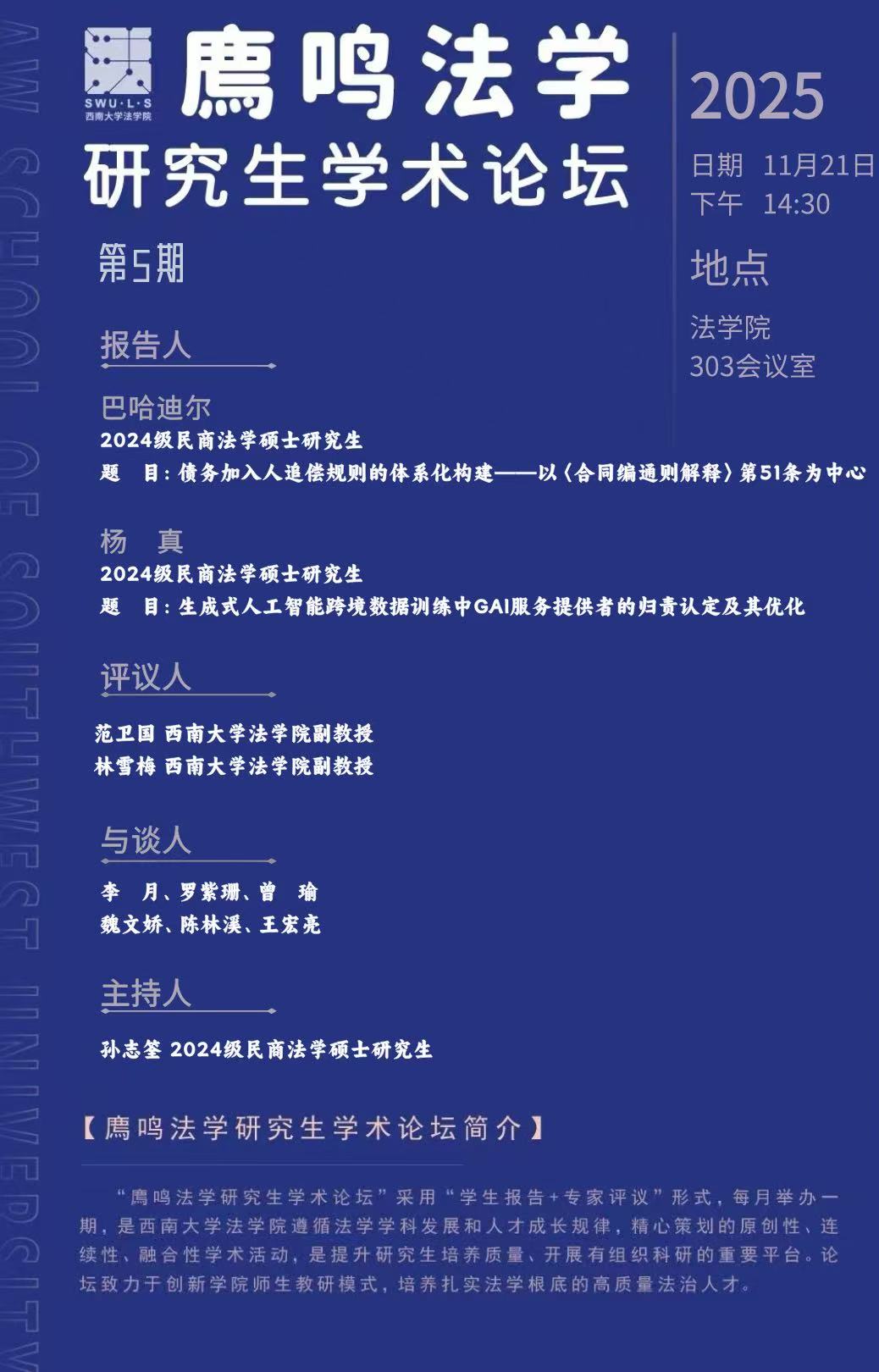 【廌鸣法学研究生学术论坛第5期】(11月21日)巴哈迪尔:《债务加入人追偿规则的体系化构建-以<合同编通则解释>第51条为中心》;杨真:《生成式人工智能跨境数据训练中GAI服务提供者的归责认定及其优化》