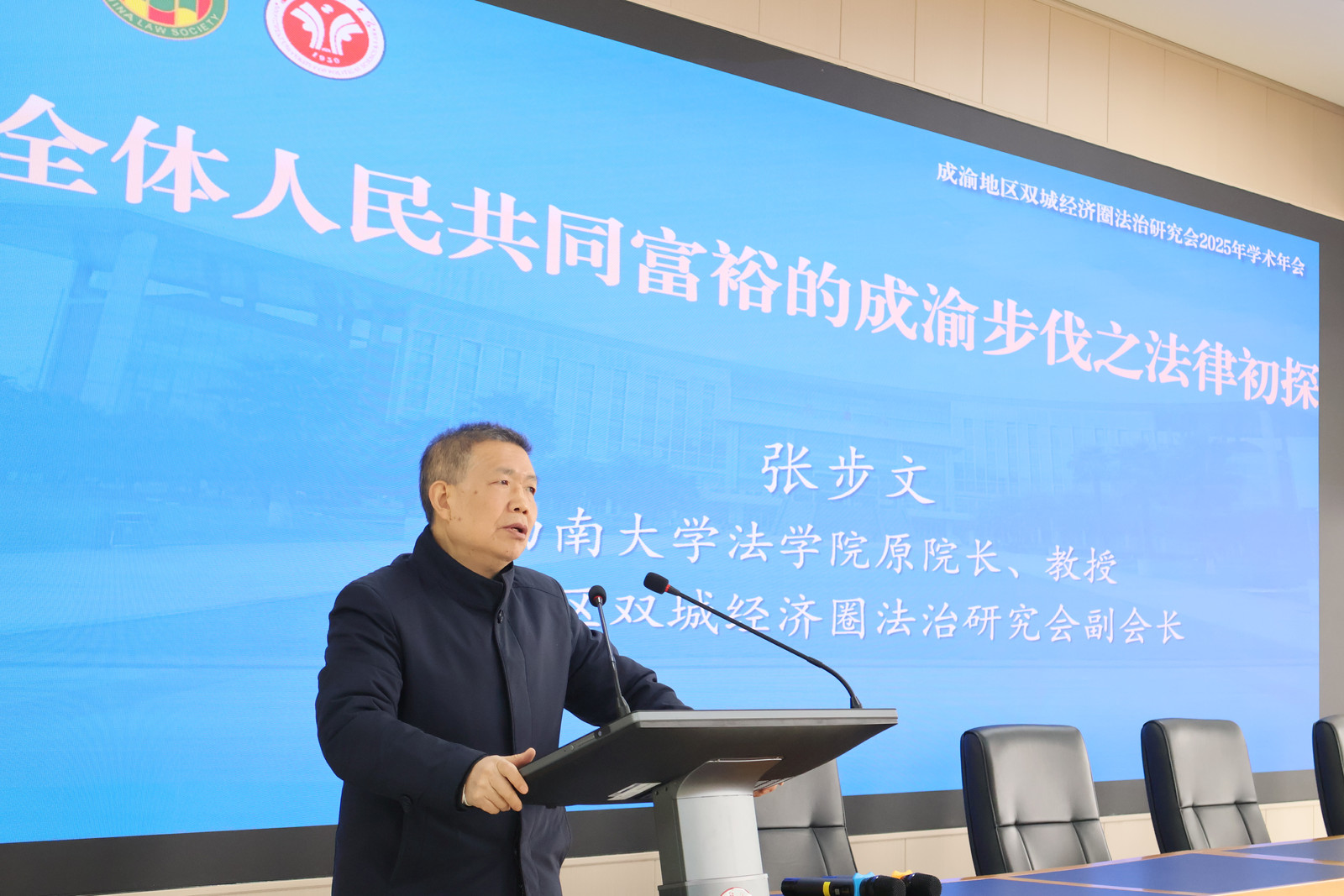 成渝地区双城经济圈法治研究会副会长、西南大学法学院张步文教授受邀在“会议主旨”环节进行主题发言,以《全体人民共同富裕的成渝步伐之法律初探》为题,结合成渝地区双城经济圈建设实际,深入剖析了共同富裕目标下区域法治保障的核心命题,提出了具有针对性的法律路径建议,其观点兼具理论深度与实践价值,引发与会嘉宾广泛关注与热烈讨论。