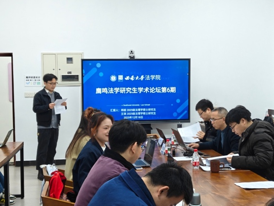 12月18日,学院在法学院116会议室举办了廌鸣法学研究生学术论坛第6期。2025级法理学硕士研究生郑超、王琪分别就《纾解中小企业融资困境的法治路径探寻》、《涉中小企业行政执法的包容审慎监管研究》作了报告,活动由学院2024级法理学硕士研究生邓云均主持,西南大学法学院副教授李明辉、贺奇兵以及讲师王文玉参与本次评议。