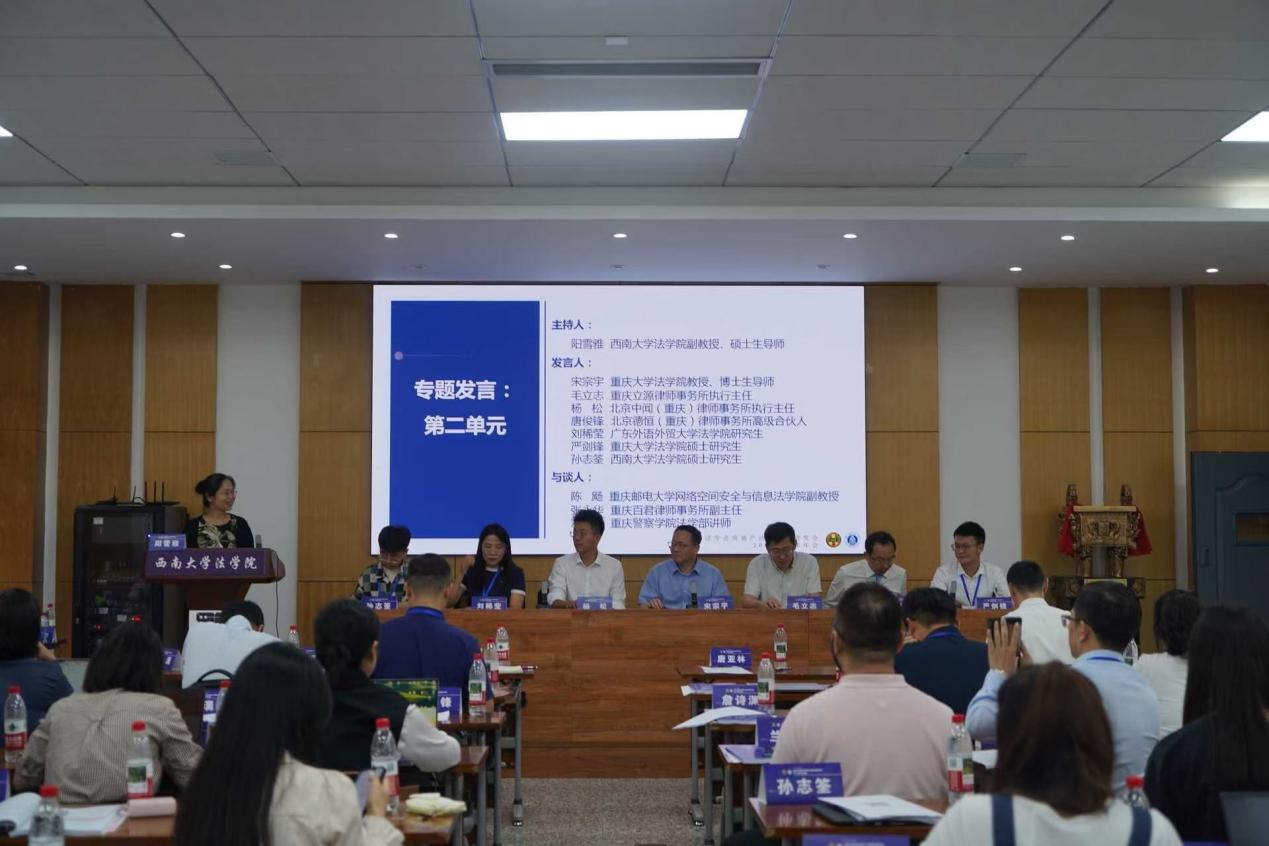 专题发言第二单元由西南大学法学院阳雪雅副教授主持。重庆大学法学院宋宗宇教授、重庆立源律师事务所毛立志主任、北京中闻(重庆)律师事务所杨松主任、北京德恒(重庆)律师事务所唐俊锋律师,及广东外语外贸大学法学院硕士生刘稀莹、重庆大学法学院硕士生严剑锋、西南大学法学院硕士生孙志筌分别围绕分包给总包资质企业的工程分包合同效力、“不具备合法经营资格的组织”与实际施工人认定、EPC工程总承包体系下分包合同效力判定、加装电梯地方立法中联合审查规范的合法性问题、空域使用权的权利定位与实现保障、西南民族地区土地治理中的调解程序进行了专题分享。重庆邮电大学网络空间安全与信息法学院陈飏副教授、重庆百君律师事务所张永华副主任、重庆警察学院法学部左智鸣老师进行了与谈。