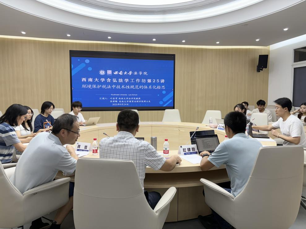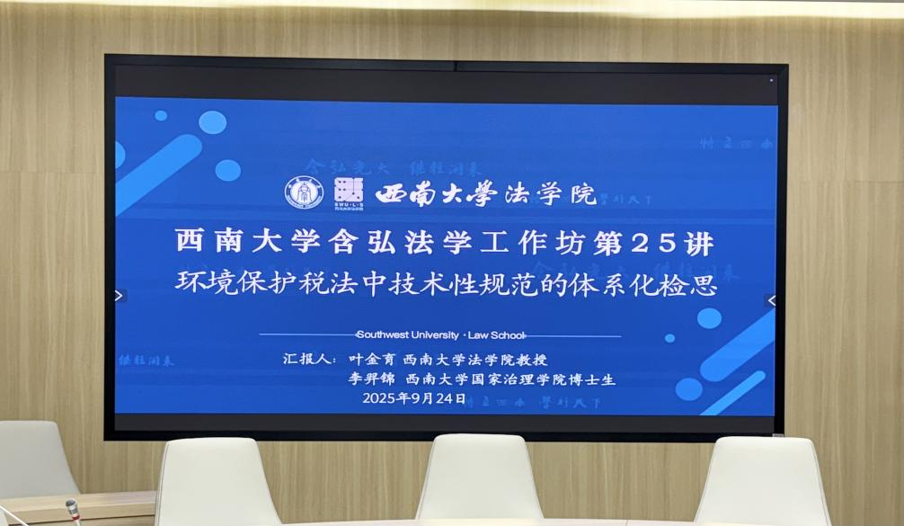 9月24日晚上,含弘法学工作坊第25期在法学院118会议室成功举办。西南大学法学院教授叶金育、西南大学国家治理学院博士研究生李弈锦以“环境保护税法中技术性规范的体系化检思”为题作了主题汇报。